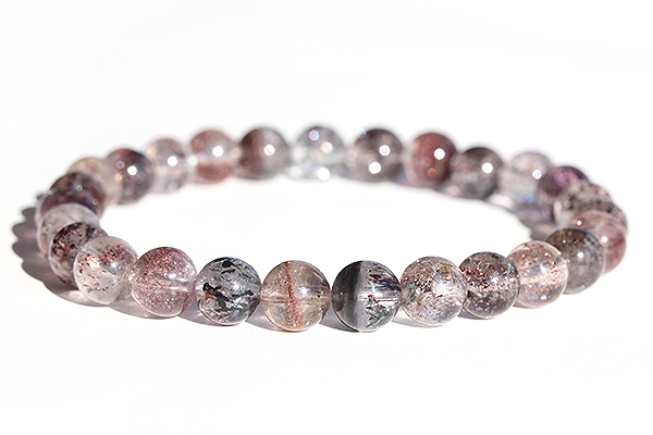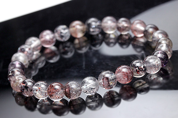 赤色のインクルージョンを取り込んだタイプや黒色のインクルージョンを多く取り込んだタイプの珠が多く見られ、落ち着いた雰囲気のブレスレットです。