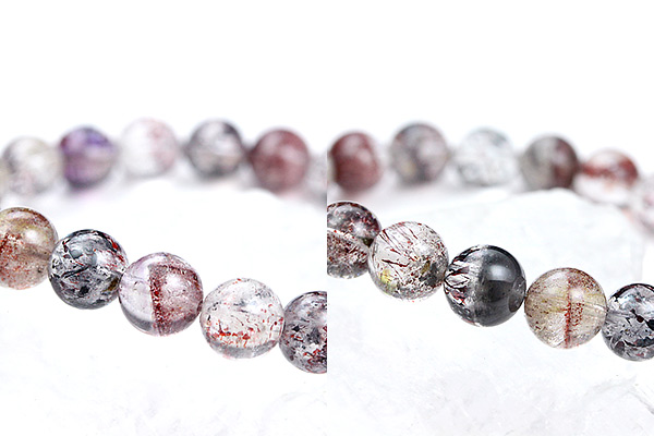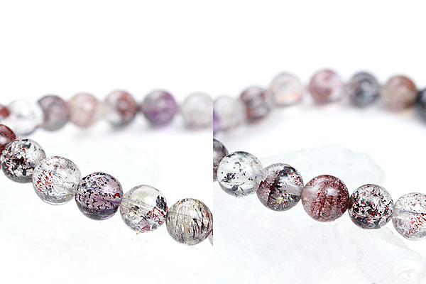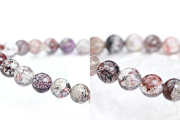 水晶をベースに、アメジストとスモーキークォーツ、インクルージョンとしてゲーサイト、レピドクロサイト、カコクセナイト、ルチルが一つの原石にまとまった奇跡の鉱物、セイクリッドセブン。