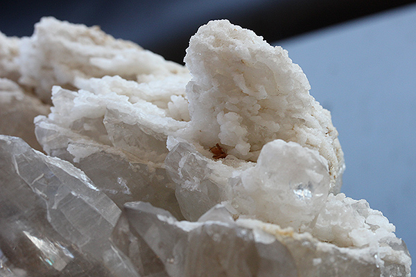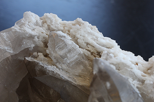 クラスターを覆うように白い雪のような曹長石が見られ、まるで険しい雪山のような荒々しさを感じさせます。