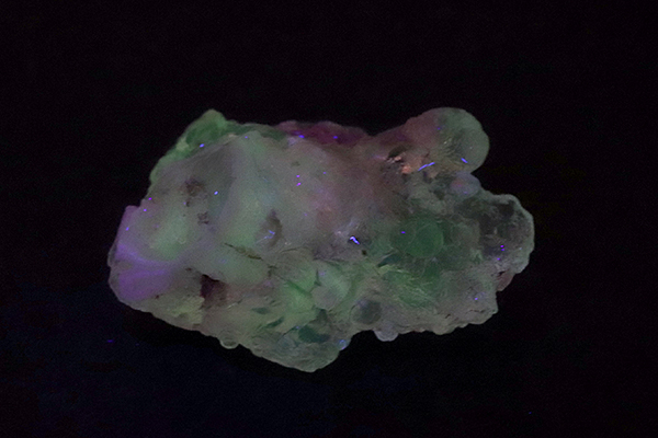 結晶化する際にごく少量の天然ウランを取り込むことで紫外線ライトで鮮やかな蛍光色を放ちます。