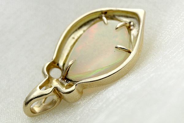 台座はつぼみをイメージしたような可愛らしいデザイン、裏面は4本の爪でオパールを留めたシンプルな作りとなっており、光を多く通すことで、より一層オパールの遊色効果が際立ちます。