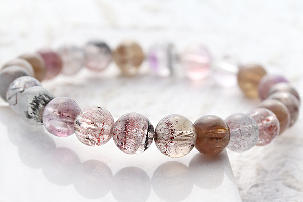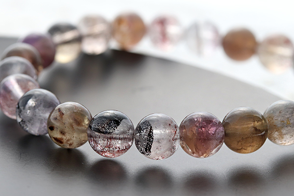 黒・赤褐色などの色味が模様を描き、神秘的で芸術的な色味の珠や、黄金色のカコクセナイトが見える珠も使用しています。