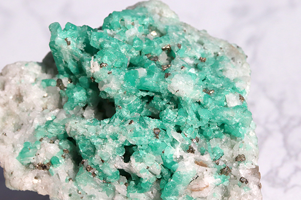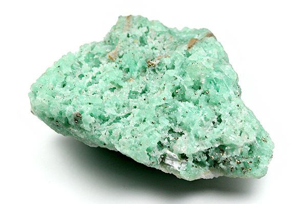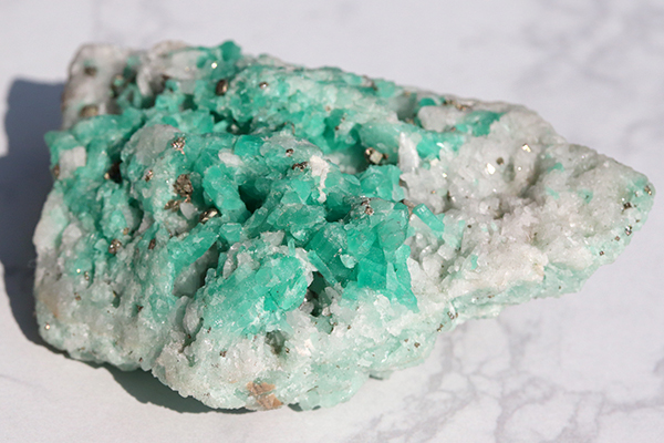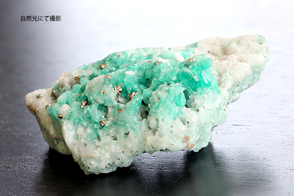 薄っすら若草色と白のまるで草原のような色味の母岩に、明るいエメラルドグリーンがモコモコと結晶しており、爽やかなその色味は見ているだけで癒やしを与えてくれそう。