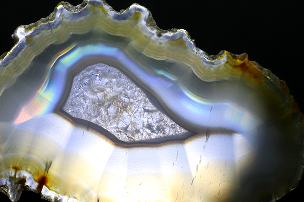 アゲート原石を薄くスライスし、ライトを照らすまでその全貌を見ることが出来ず、またその原石の中でもごく一部の部分のみにしか綺麗な虹色の輝きを見ることが出来ない「幻のアゲート」と呼ばれています。