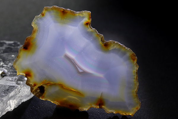 アゲート原石を薄くスライスし、ライトを照らすまでその全貌を見ることが出来ず、またその原石の中でもごく一部の部分のみにしか綺麗な虹色の輝きを見ることが出来ない「幻のアゲート」と呼ばれています。