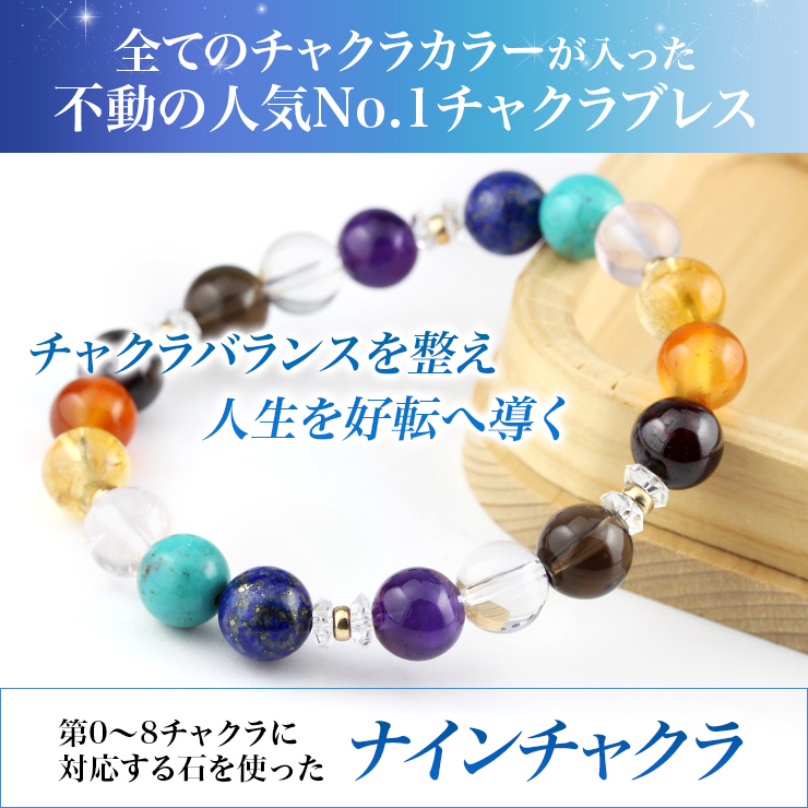 チャクラの数については諸説ありますが、こちらのブレスレットには、身体の経絡に沿って存在する主要な7つのチャクラに、さらに地面と接する足の裏にあると言われる第0チャクラ、そして自分の頭上にあるとされる第8チャクラまでを網羅した9つのチャクラに対応するブレスということで、【ナインチャクラ】と名前をつけております。