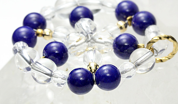 このラピスラズリに水晶をバランス良く繋ぎ合わせて、外枠として一つの円を造りあげました。