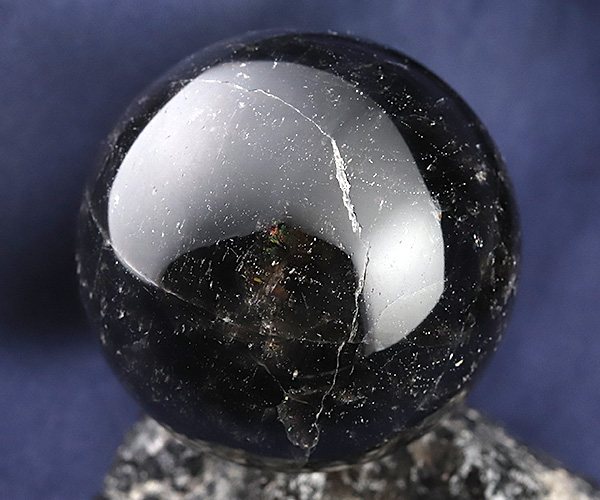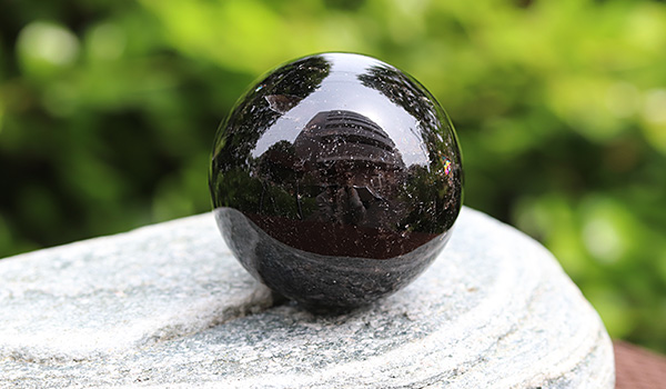 向こう側が全く透けない上質な黒水晶で、光を跳ね返し重厚に艷やかに輝く、思わず見惚れてしまうこと間違いなしの丸玉です。