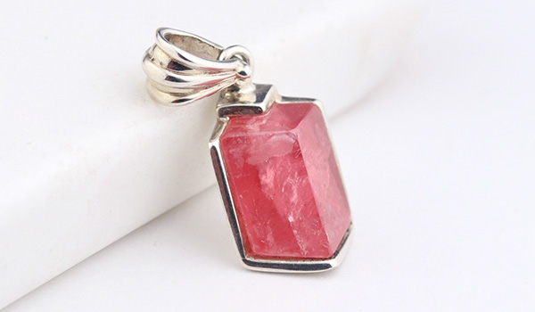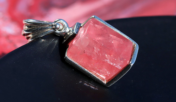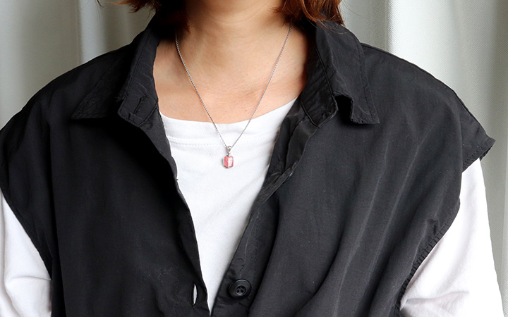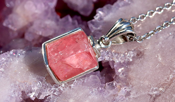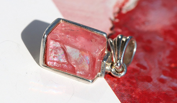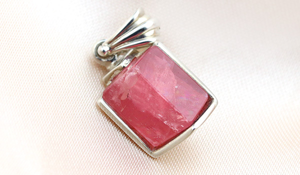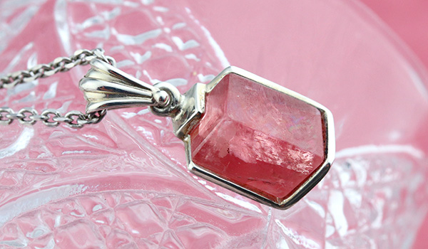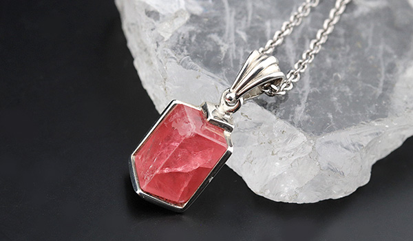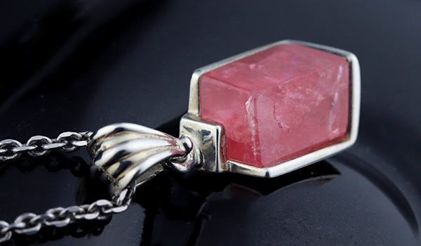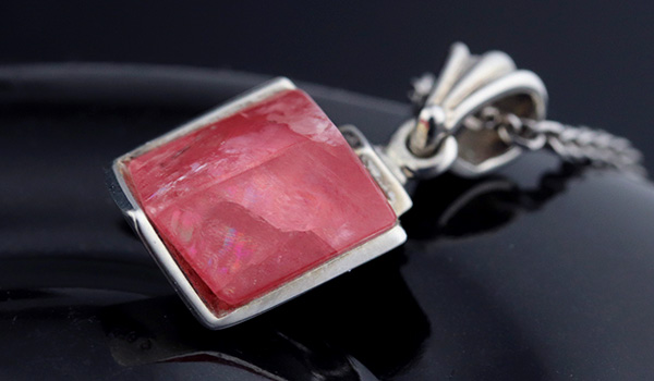 和名で菱マンガン鉱と呼ばれるように、インカローズの菱面体形状の結晶形をそのまま活かし、表面を滑らかに磨き上げて、シルバー925素材のペンダント台座にセッティングいたしました。