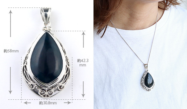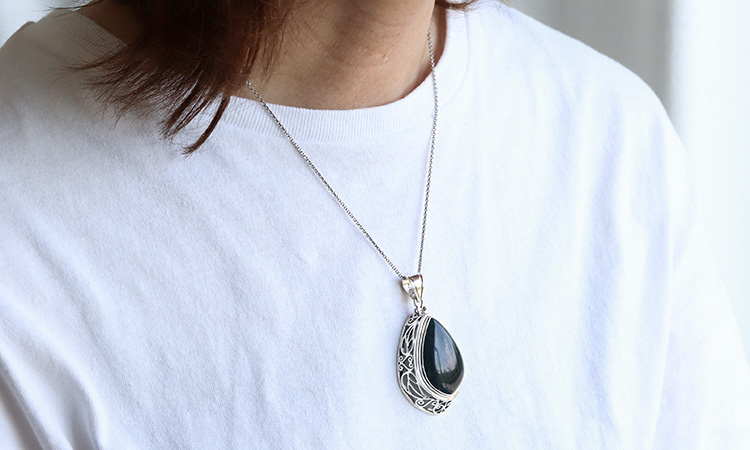 葉っぱを模した細かなシルバーの透かし彫りを施すことで、ペンダントの雰囲気をぐっとアンティークなものにしています。