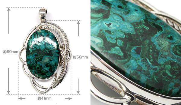 大ぶりのクリソコラマラカイトからあふれ出す力強いエネルギーに、細かな装飾の合わさった神石(カムイ)ペンダント。