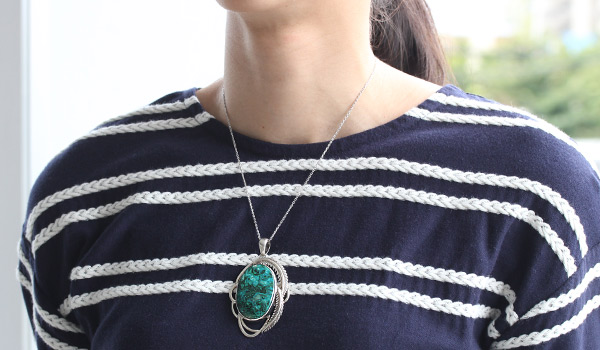 シンプルな装飾は、クリソコラマラカイトの魅力を引き立て、より一層素晴らしいアクセサリーに仕上げています。