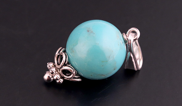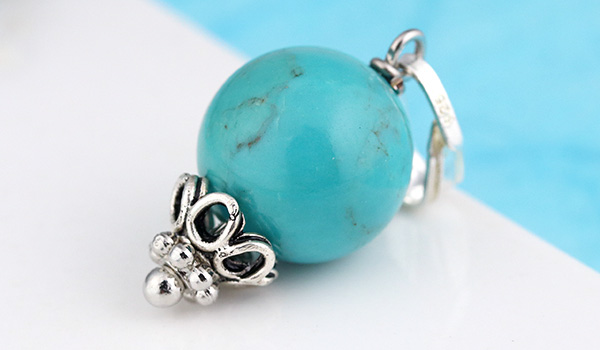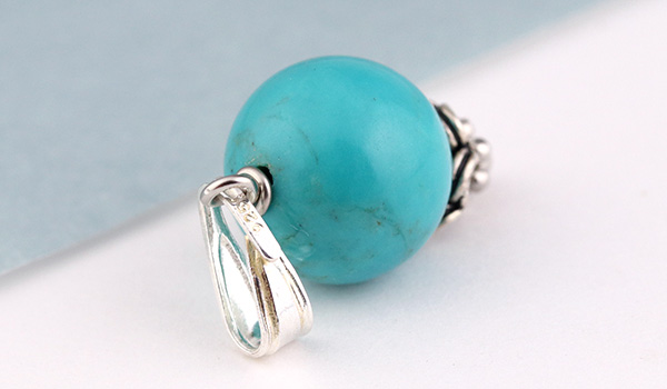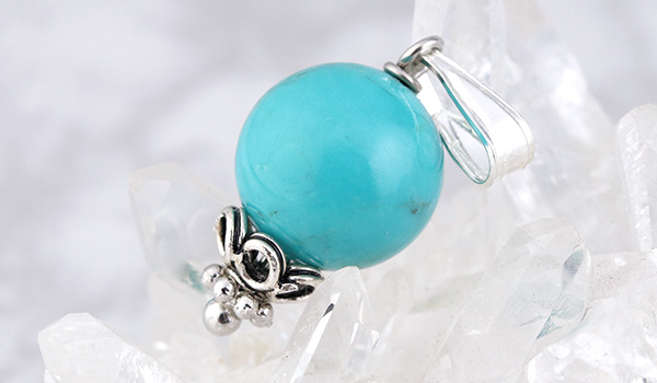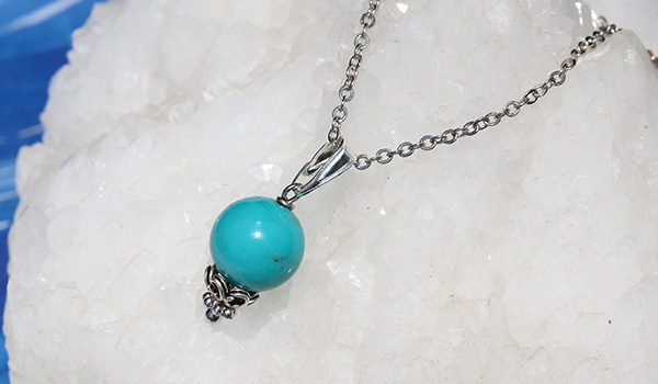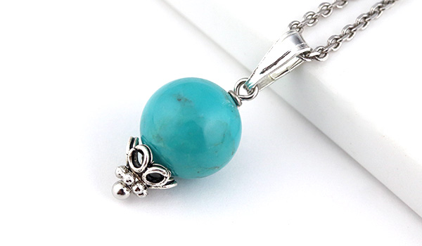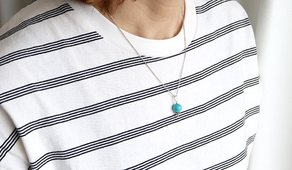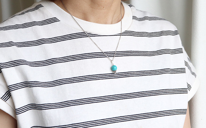 うっすらグリーンの色味が混じった、落ち着いたブルーの発色が美しいターコイズの10mm珠を使用した、1粒タイプのペンダントです。