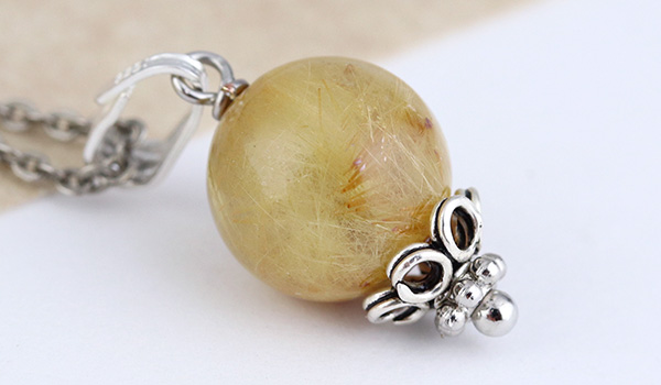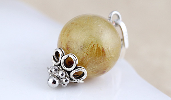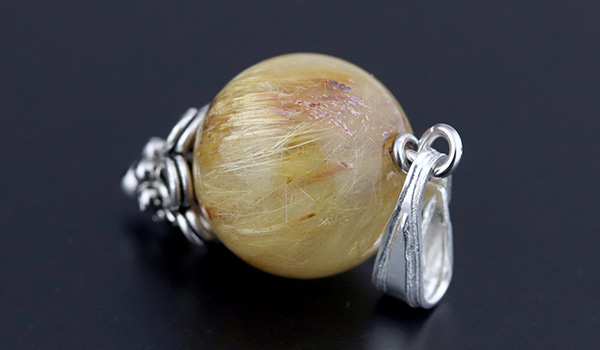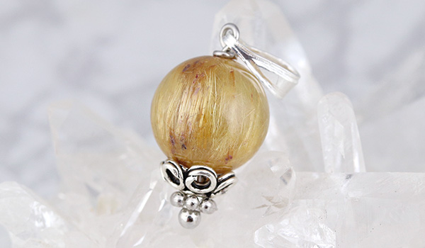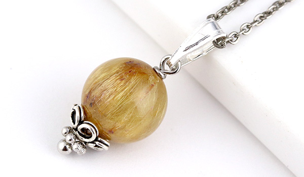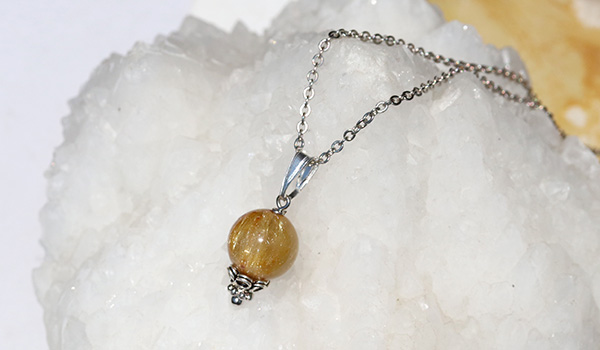 キラキラ輝く黄金色の直線的なルチルがたくさん閉じ込められているルチルクォーツの10mm珠を使用した、1粒タイプのペンダントです。