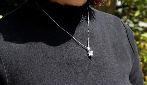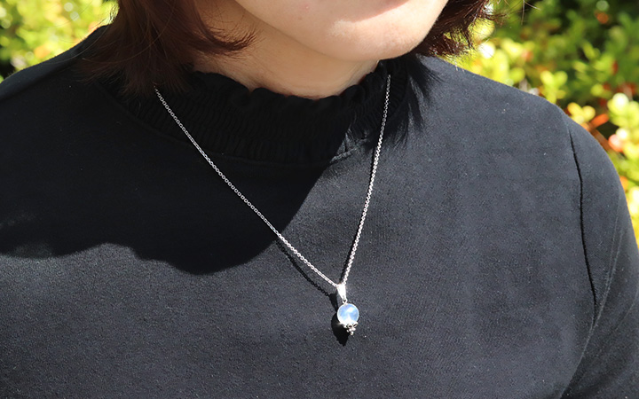 シンプルデザインのペンダントながら、あなたの動きに合わせて浮かび上がるブルーシラーの輝きによって