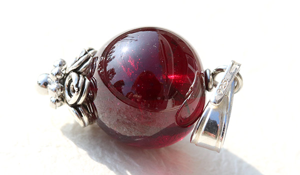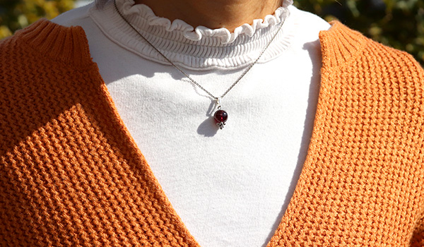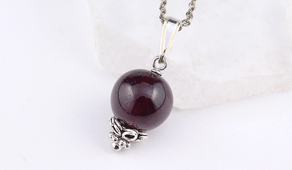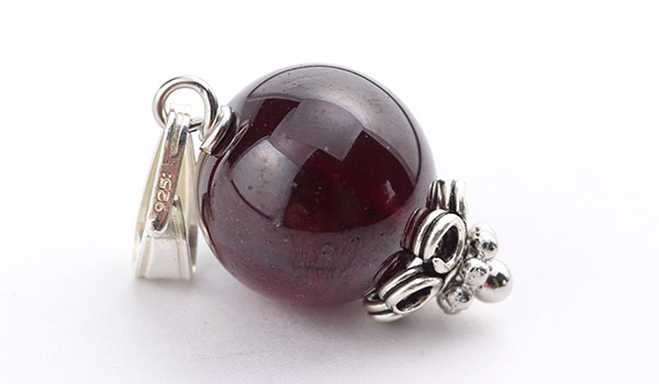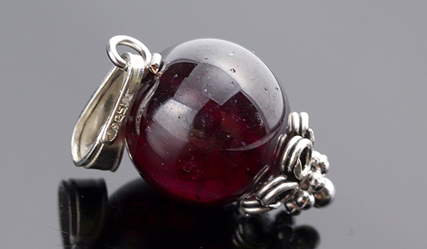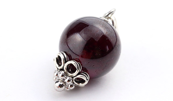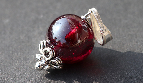 薄っすらとした紫の輝きを帯びた美しいワイン色へと表情を変えるロードライトガーネットの10mm珠を使用した、1粒タイプのペンダントです。