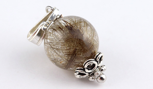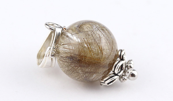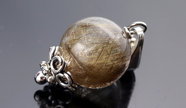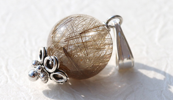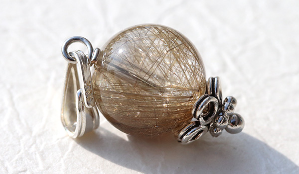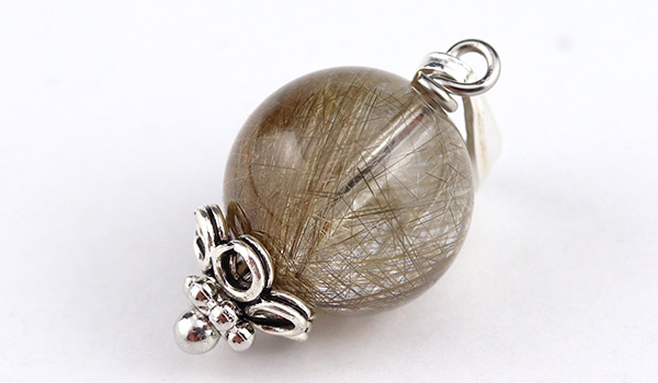 内部に閉じ込められたルチルが、照り輝くような光沢感を表すシルバールチルクォーツの10mm珠を使用した、1粒タイプのペンダントです。