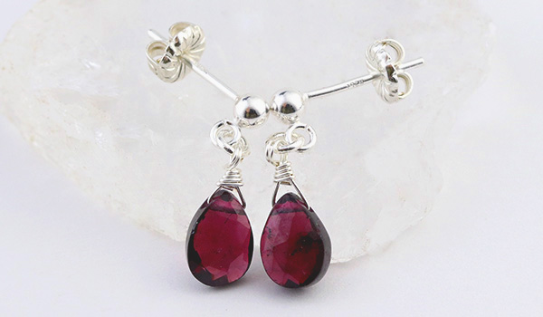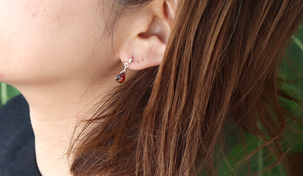 厚みを抑えたしずく型のシルエットが上品かわいい、フラットドロップカットのガーネットを使用した、耳の直ぐ側でゆらゆら揺れるスタッドピアスです。
