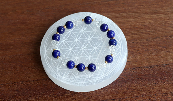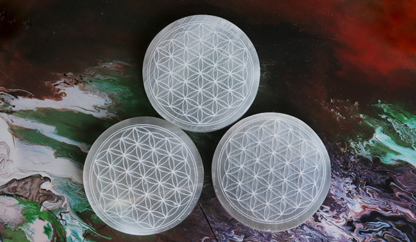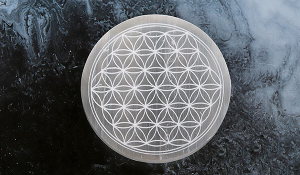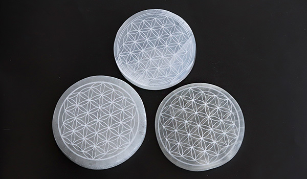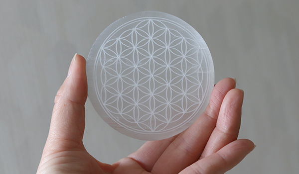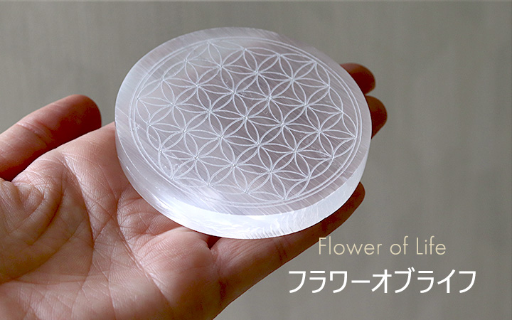 厚さのあるモロッコ産セレナイトのプレートに、フラワーオブライフの刻印を施したアイテムです。