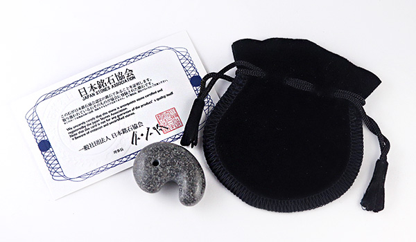 こちらの富士溶岩石は許可を得て採掘されたもので、日本銘石協会のギャランティカードと勾玉を持ち運びする際に便利なポーチも一緒にセットにしてお届けいたします!