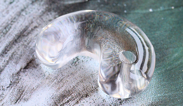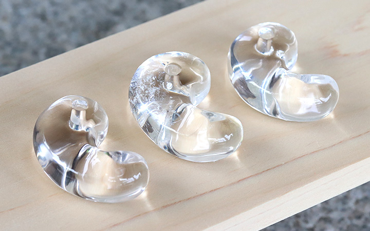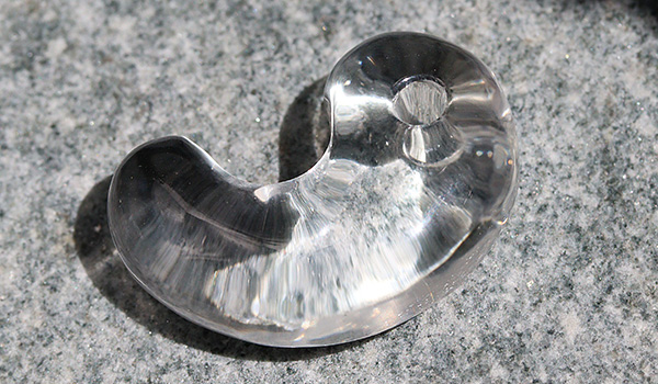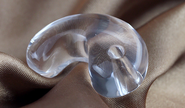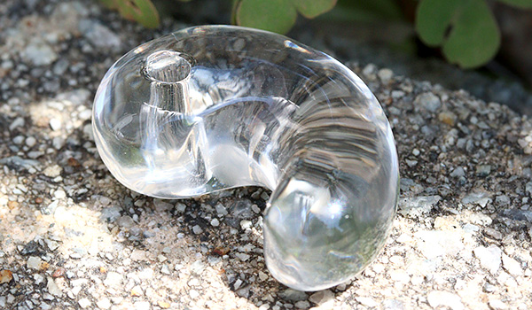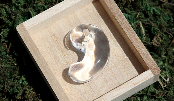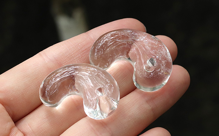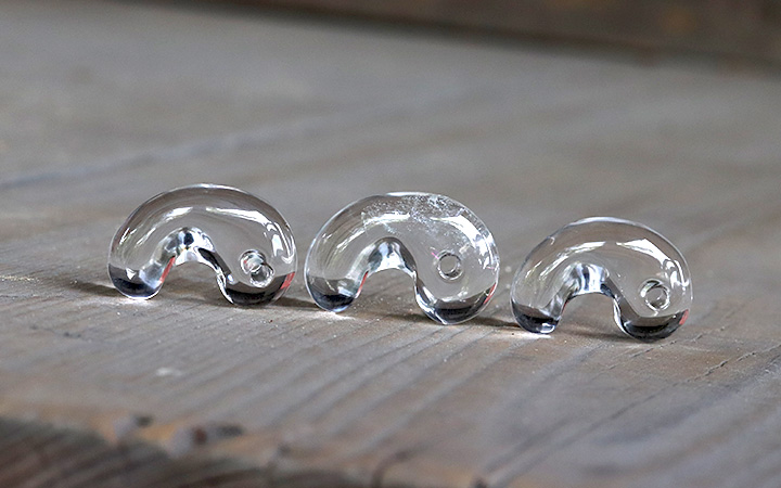 向こう側を透かしてみせる圧倒的な透明度の高さ、そして内側から光が溢れ出すようなうるうるとした艷やかな輝きに、思わず見惚れてしまうこと間違いなしの水晶の勾玉が