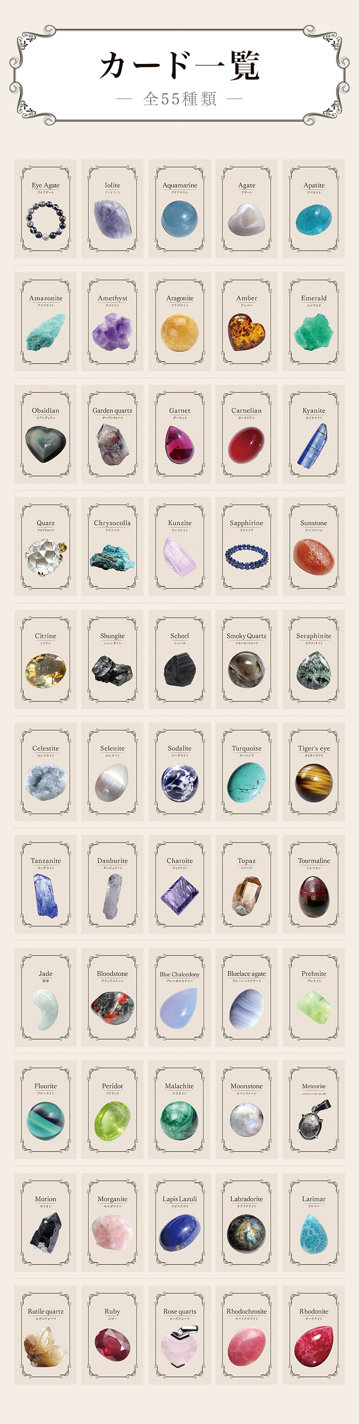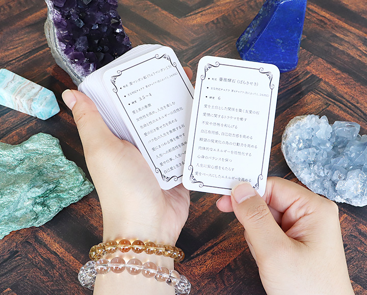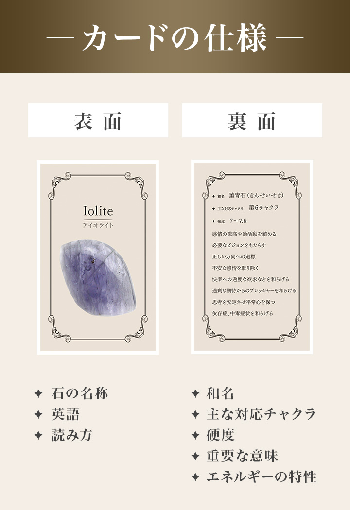 シンプルなデザインで、表面には石の名前とイメージが、裏面には和名・対応チャクラ・硬度・重要な意味やエネルギー特性が記載されています。