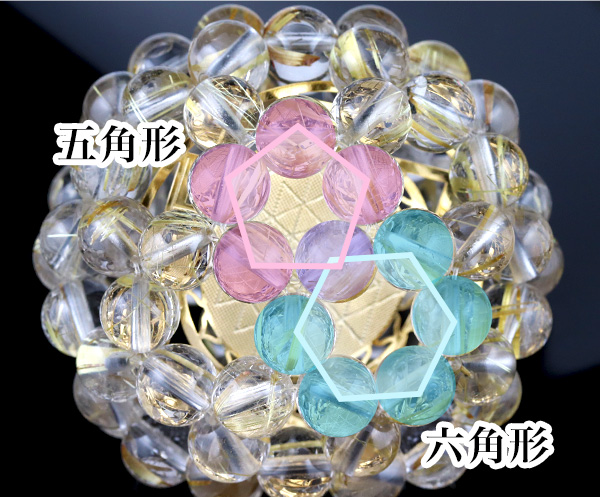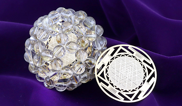 シュリヤントラ自体に図形としての強いエネルギーが備わっていますが、その形状エネルギーがタイチンルチルクォーツで編み上げられたバッキーボールと組み合わさることで、