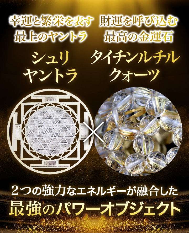 このようにタイチンルチルクォーツのエネルギーをさらに増強化するバッキーボールと、精神的にも物質的にも豊かさをもたらすシュリヤントラを組み合わせたことで素晴らしい相乗効果が生まれ、