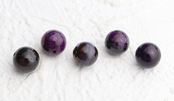 こちらは、多面カットを施してキラキラ光るモリオンを中心に、紫色と黒色とが混じり合うスギライトを並べました。