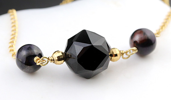 モリオンの両サイドにはK18素材のミラーボールビーズをアクセントに組み込み、アクセサリーパーツに合わせて華やかな輝きの美しいゴールドフィルドチェーンで両吊りタイプのデザインに仕上げました。