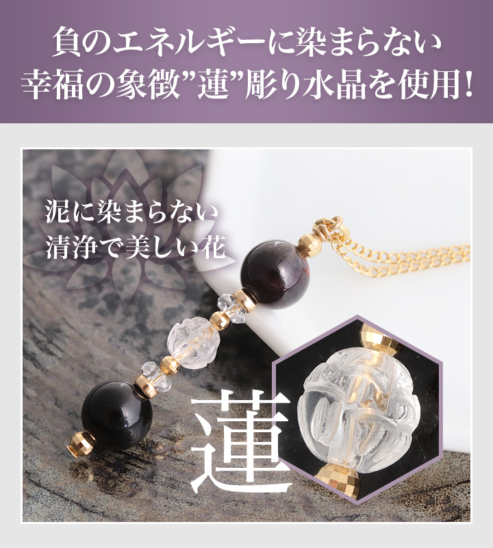 さらにこのネックレスには、蓮を彫り込んだ水晶ビーズを組み合わせています。