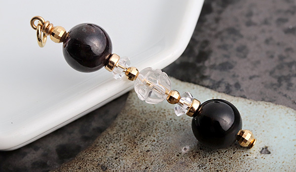 こちらはスギライトにロータスカットの水晶、モリオンを並べたスリーストーンスタイルで、ポイントにK18素材のミラーボールビーズとゴールドフィルド素材のドーナツビーズを組み込みました。