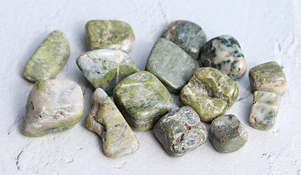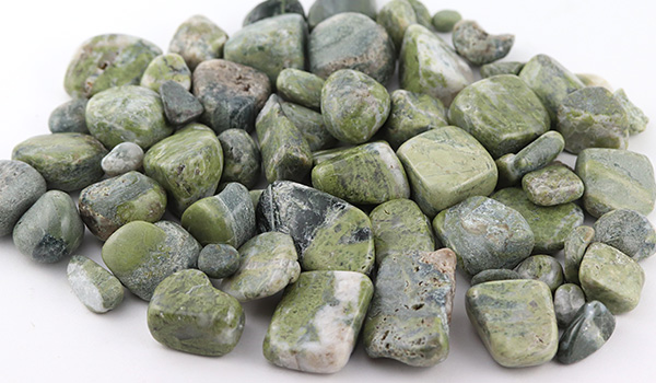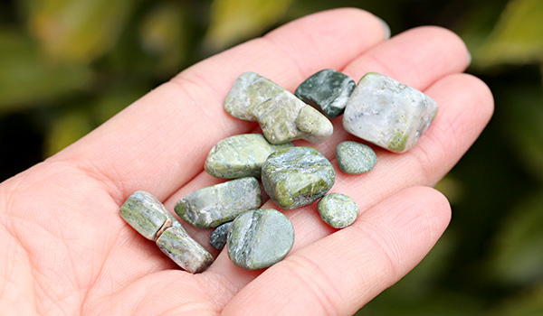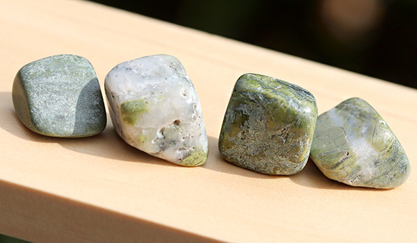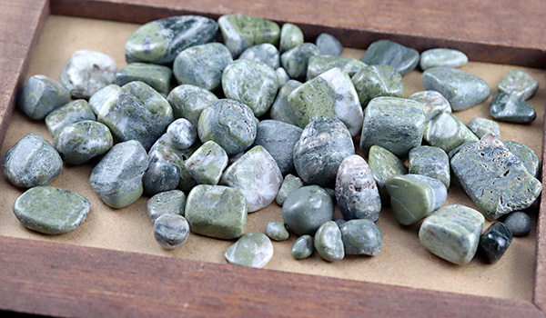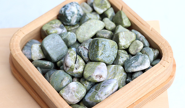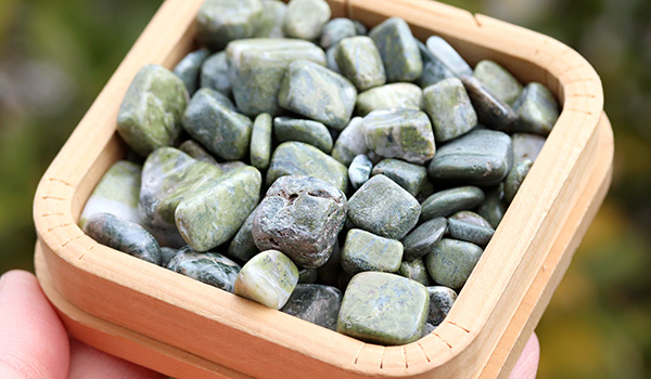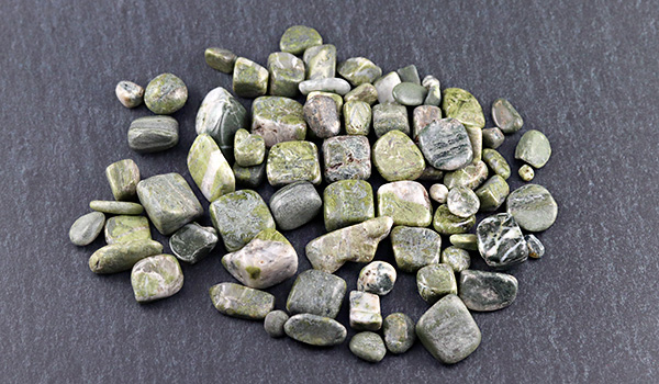ソロモナイトは岩石のため、色合いは落ち着いたトーンのものが多く、抹茶色や渋みを感じさせる深い緑色のもの、黒っぽいものや白っぽいものなど、ひとかけらごとに色味が異なるさざれが1パックの中に詰められています。