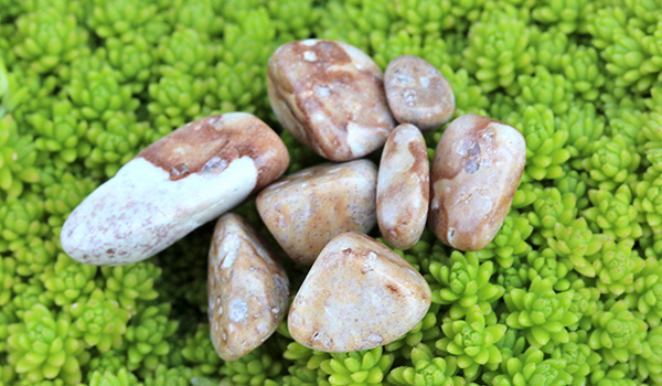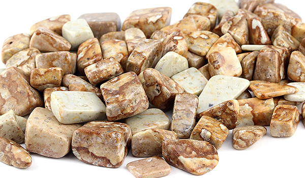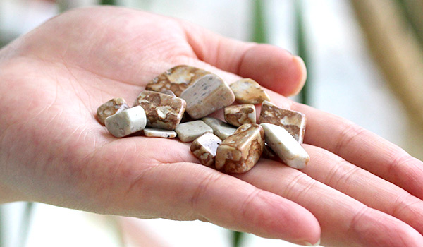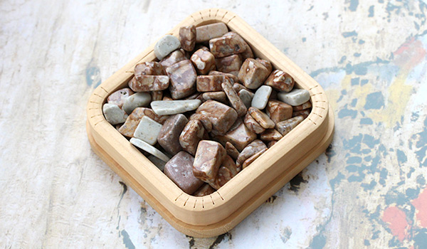 灰色がかった白色やベージュがかった色合い、赤茶色などがひとつひとつのさざれ石の中に複雑に入り組んで、それぞれに個性あふれる模様を描くさざれ石たちが1パックに入っています。