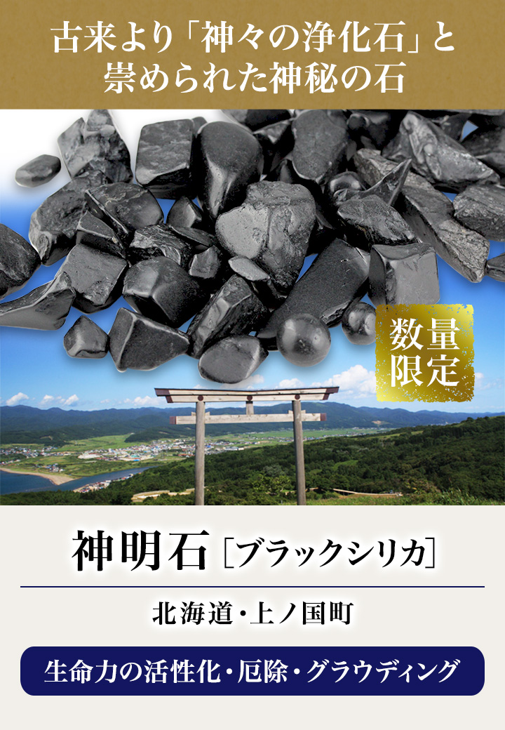 「神の力が宿る石」「神々の浄化石」と信仰した神秘のパワーストーンである神明石は、珪石の中に黒鉛(グラファイト)が混じるという