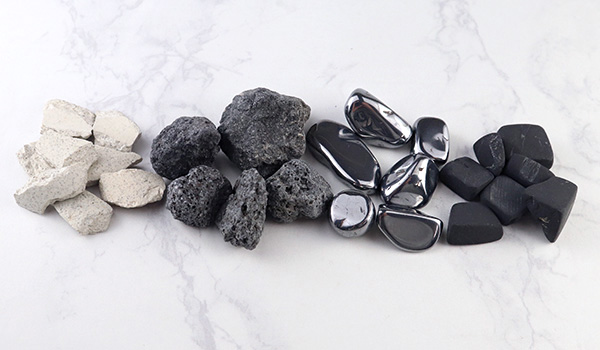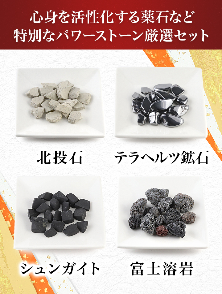 北投石50g、テラヘルツ鉱石(人工鉱石)65g、シュンガイト65g、富士溶岩70g