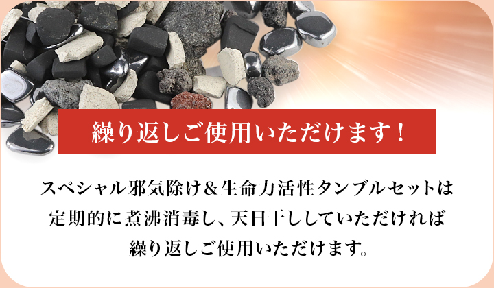 スペシャル邪気除け&生命力活性タンブルセットは、定期的に煮沸消毒し、天日干ししていただければ繰り返しご使用いただけます。