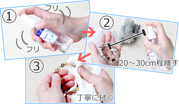 浄化をしたいパワーストーンから20〜30cmほど離し、パワーストーンに向けて2〜3回ほどミストを吹きかけます。