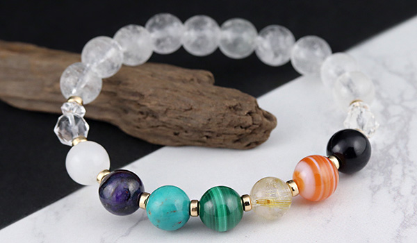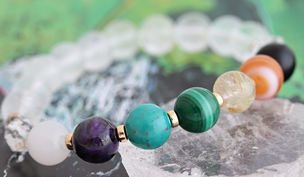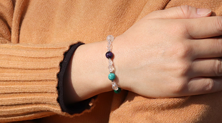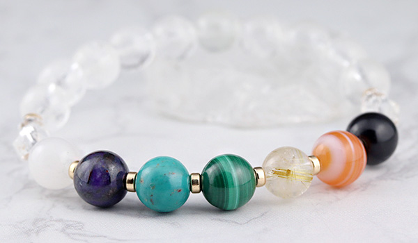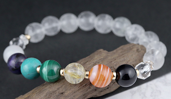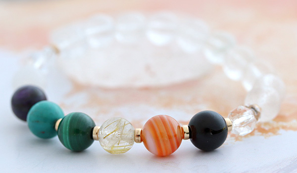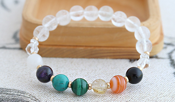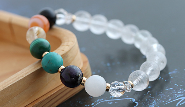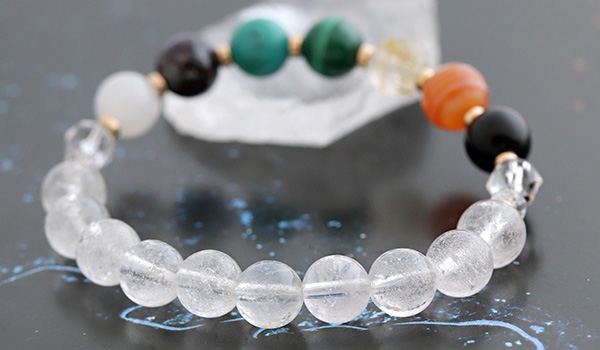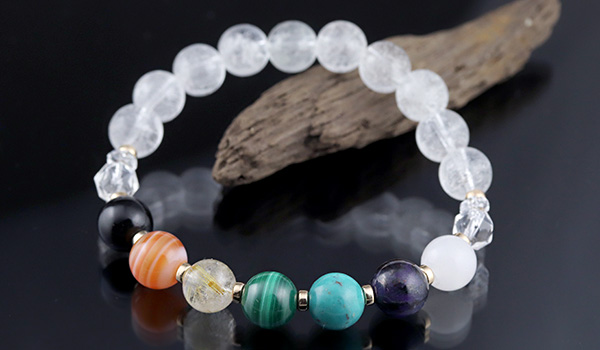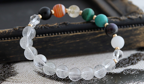 厄除けブレスには、七色のパワーストーンたちとともに水晶を組み合わせています。