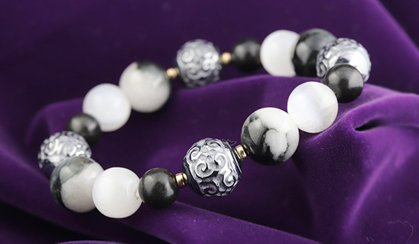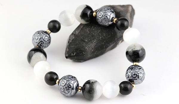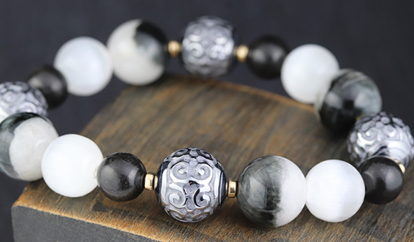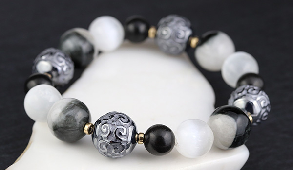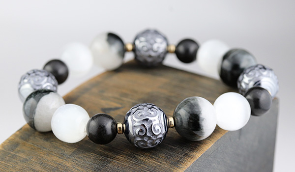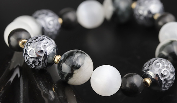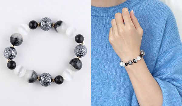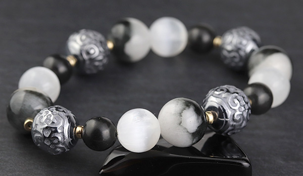 このブレスレットには、デザイン的にも陰陽を表現するために、陰陽カラーとして用いられる白色と黒色のパワーストーンを使用しました。