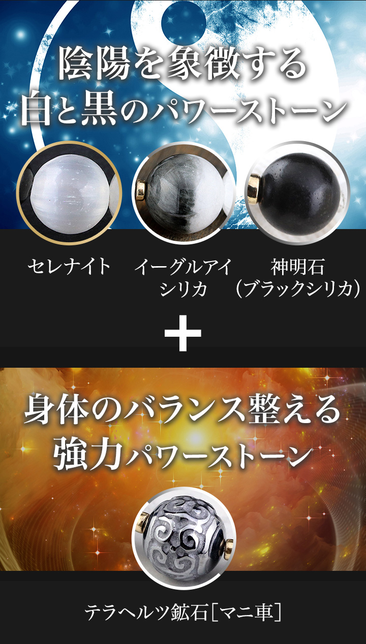 また、うっすら透明感のある優しい乳白色の地色に、美しい光沢感のある光のラインがくっきりと浮かび上がる”セレナイト”に、炭を思わす少しマットな黒色が印象的な”神明石[ブラックシリカ]”を繋いで、陰陽のイメージを強化。