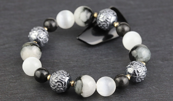 ●陰陽をテーマに、モノトーンカラーの中にメタリックな輝きが光るブレスレット