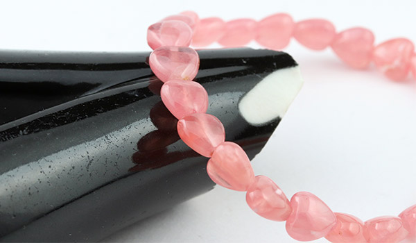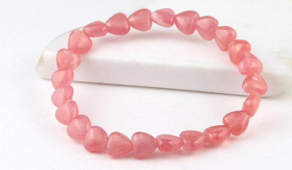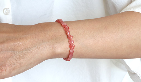 華やかで美しい色合いから女性人気が高く、最近では希少価値の高まりを受けて価格が高騰しているインカローズのハートカットビーズを使用したブレスレットです。