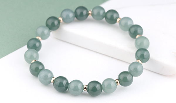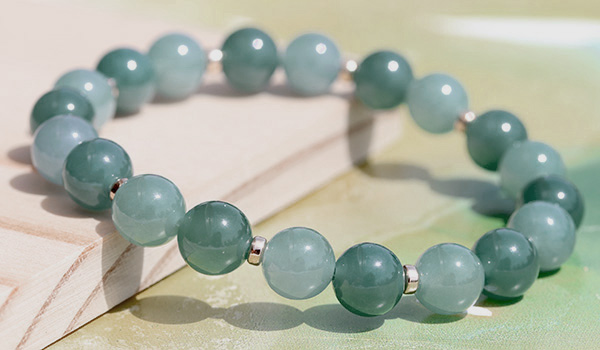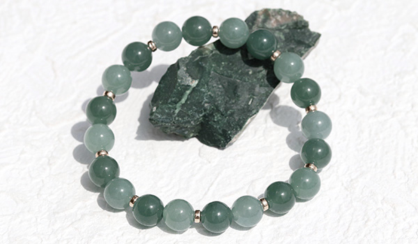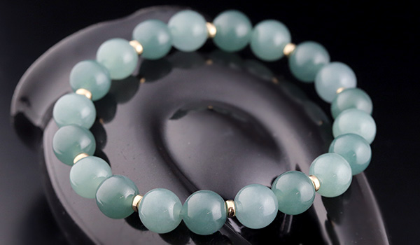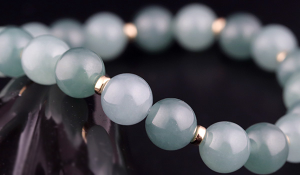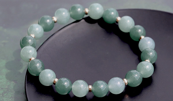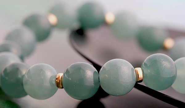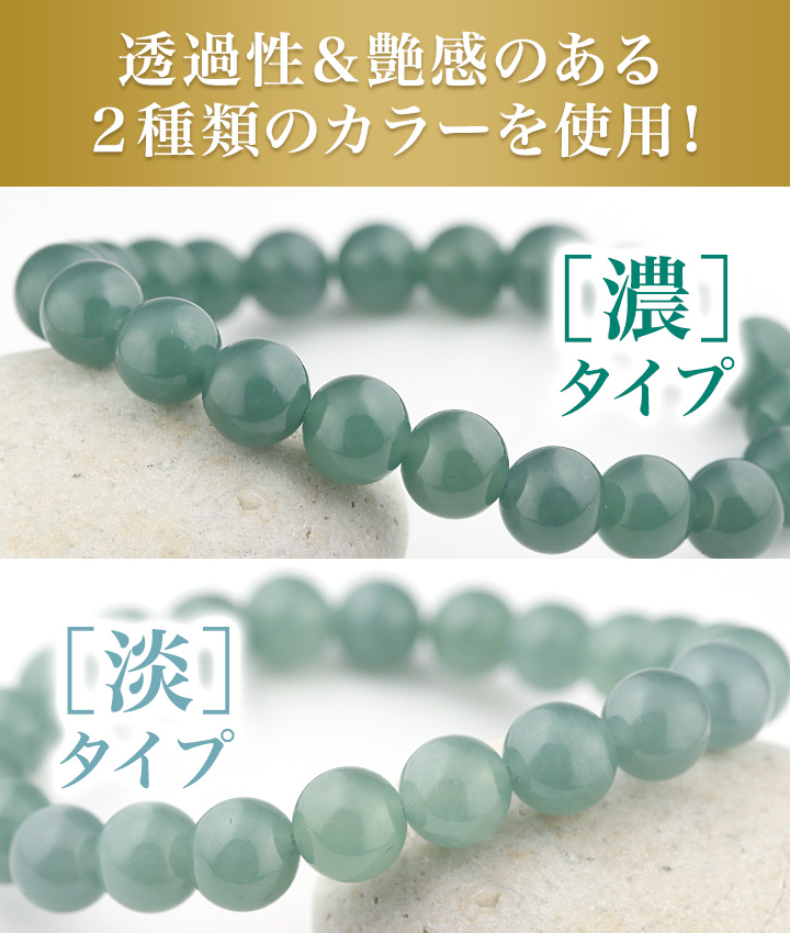 マットな質感ながらしっとりとした光沢感が見られる翡翠を使用し、ビーズの裏側から強い光を当てると、