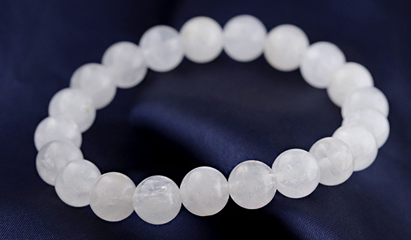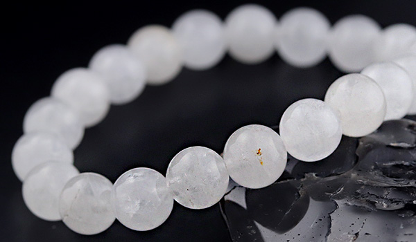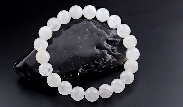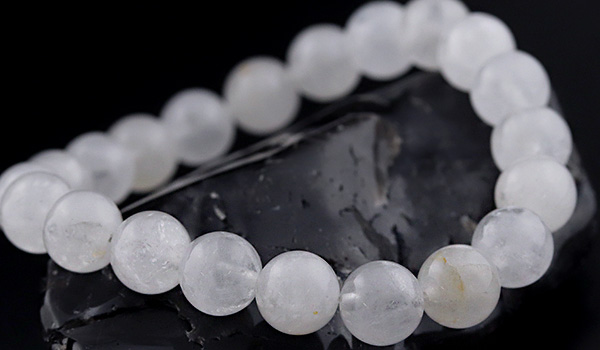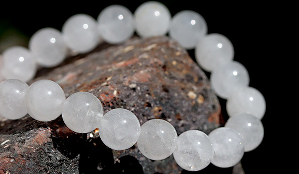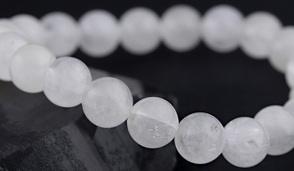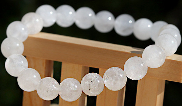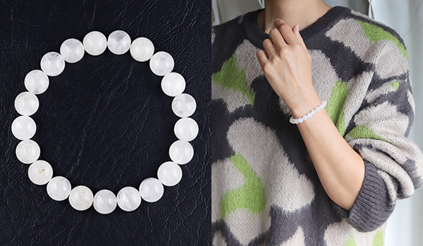 今回ブレスレットに使用している水晶ビーズは、市場に多く流通するクリアなものではなく、靄がかったような柔らかい白色になっていること。