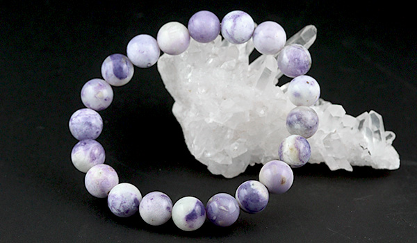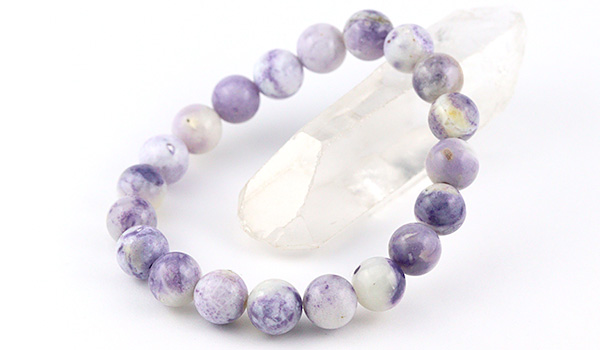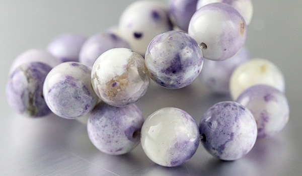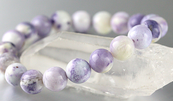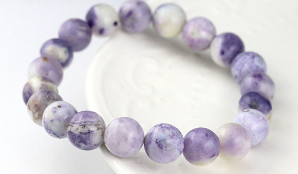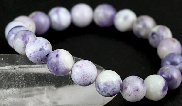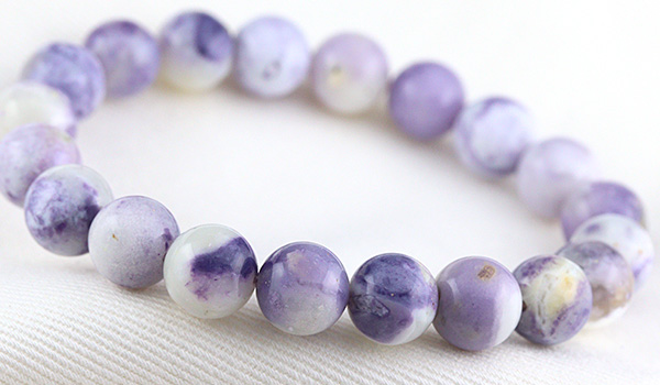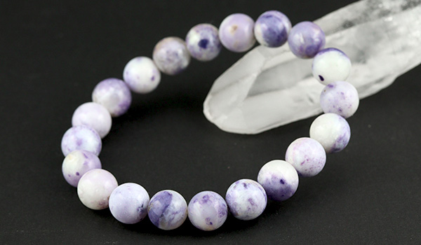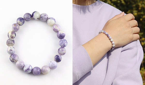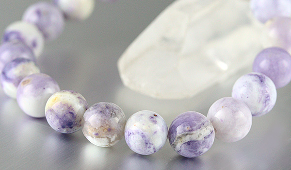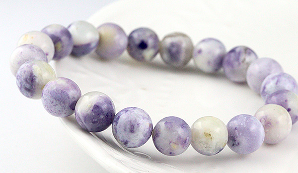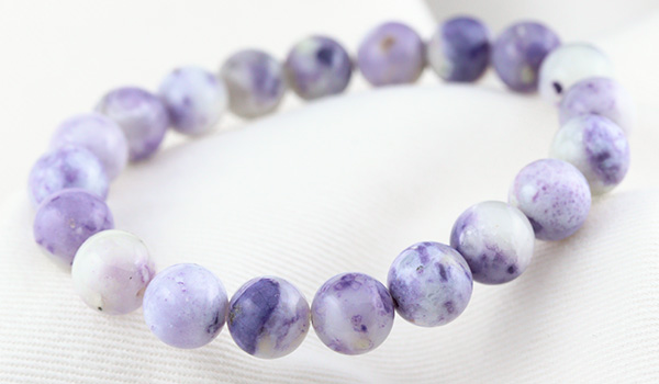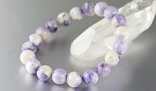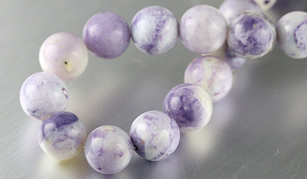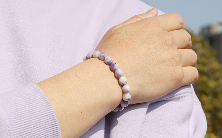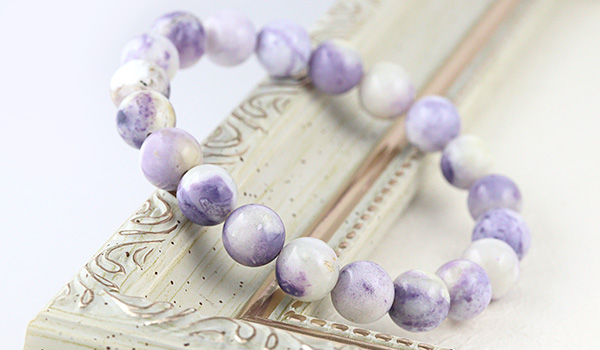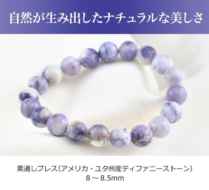 今回入荷できたティファニーストーンは、白色がベースとなりそこに淡い紫色が溶け込むように入った、柔らかい雰囲気のビーズを贅沢にも素通しのブレスレットに仕上げました。