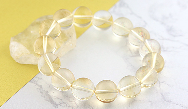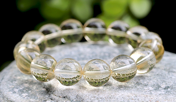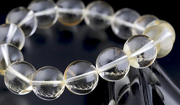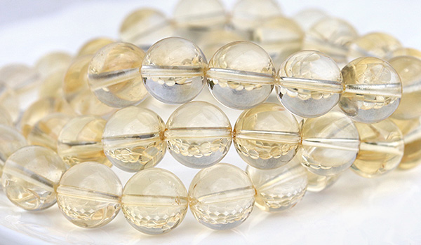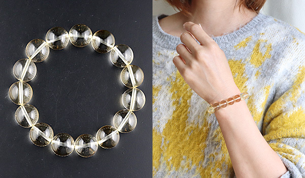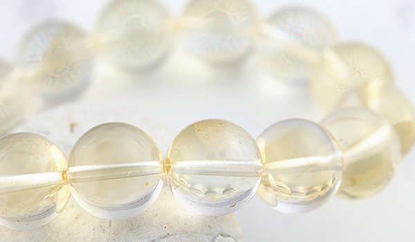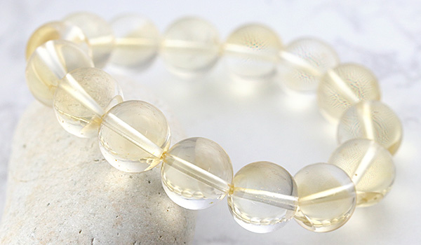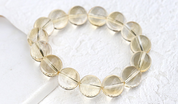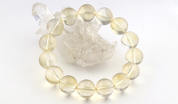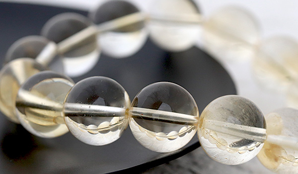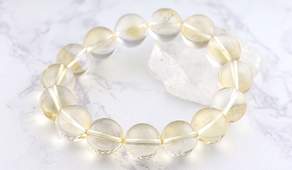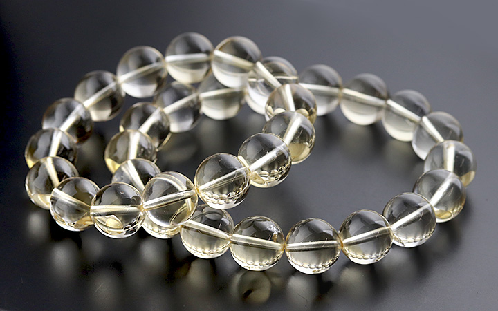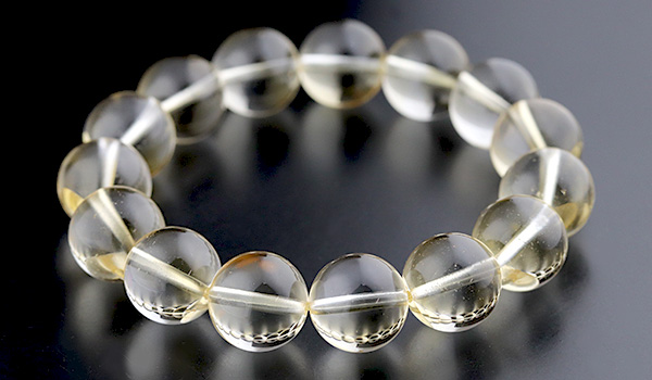 光のかけらを閉じ込めたかのような淡い黄金色の透き通るような発色が美しく、クラックもほとんども見られない、とても美しいシトリンの11.5〜12mmビーズを使用したブレスレットが、