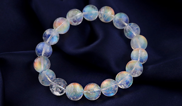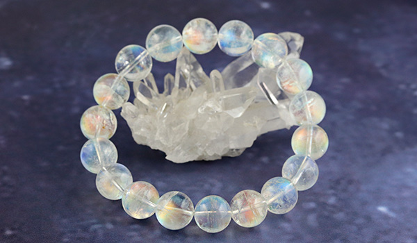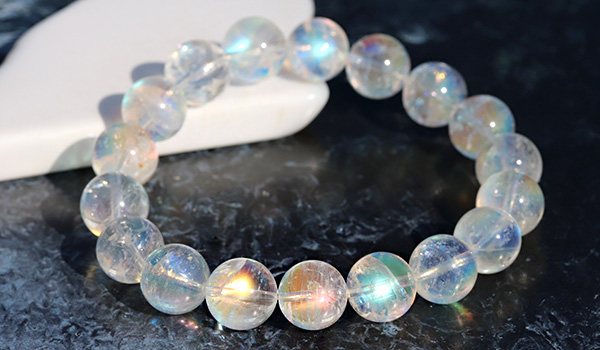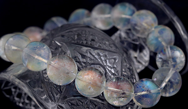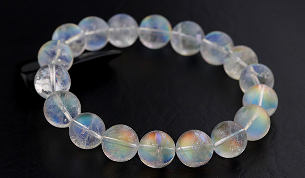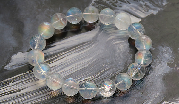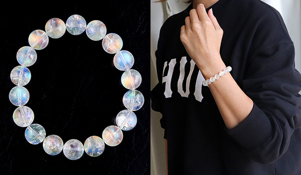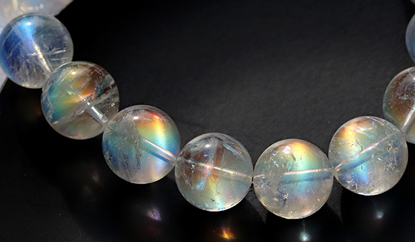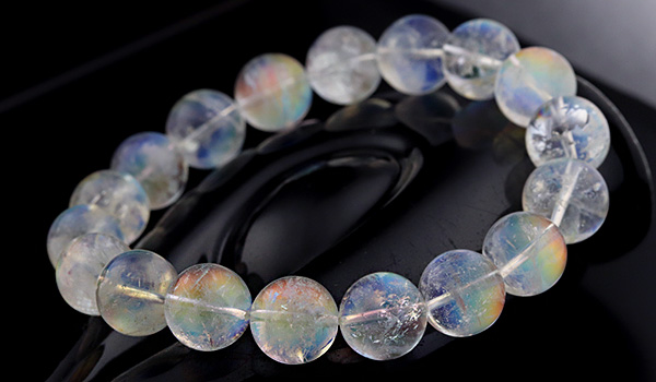 こちらのブレスレットの素晴らしいところは、ビーズの一粒一粒に明瞭な虹色の輝きが浮かび上がること!