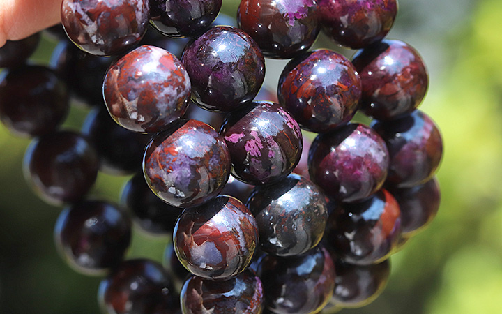 一般的な室内光ですと赤黒く見えますが、太陽光や蛍光ライトを強く当てると赤茶色主体の色彩の中に、黒や灰色〜青灰色、紫や紫ピンクのような色合いの部分が、まだら模様のようになっているのが分かります。