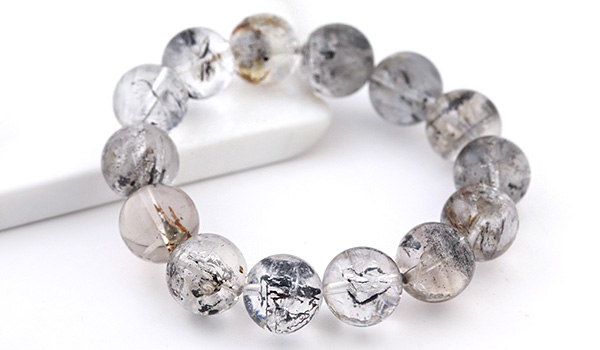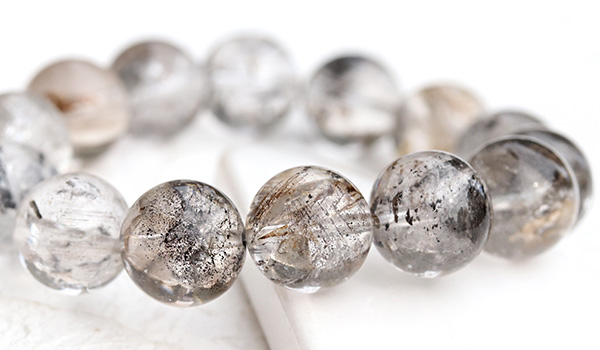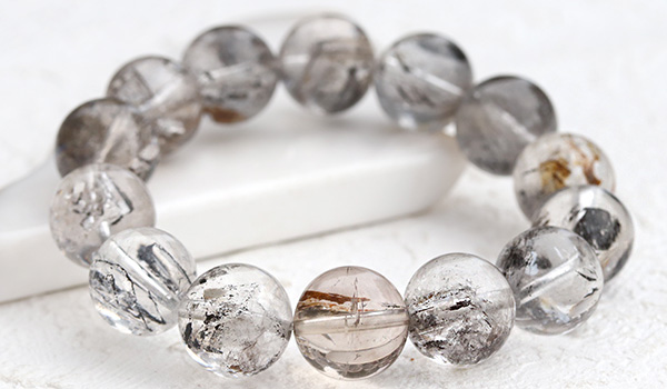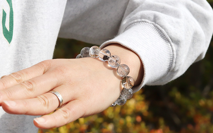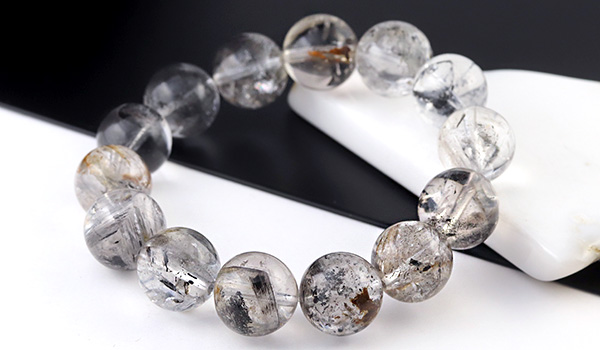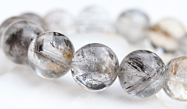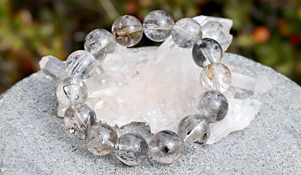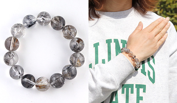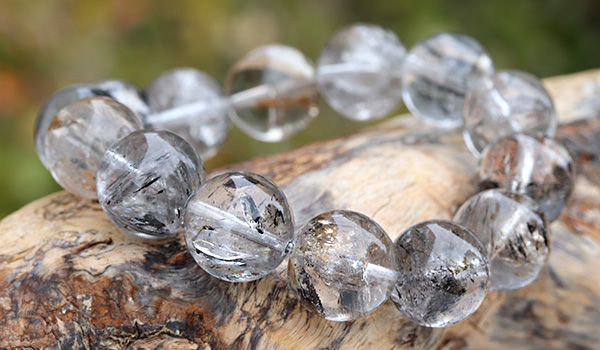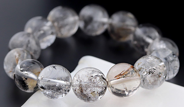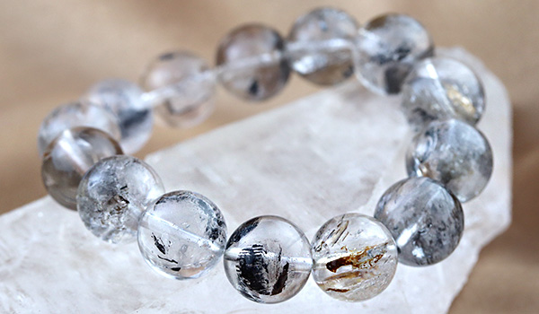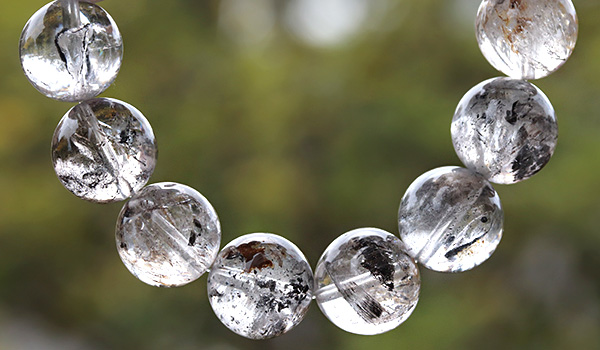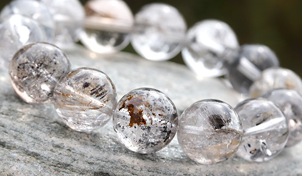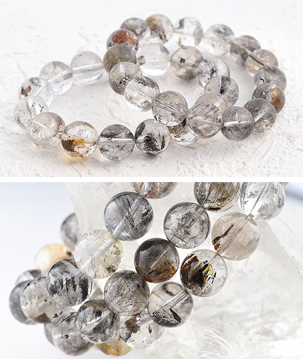 こちらのブレスレットには水晶に透明度があり、黒色のインクルージョンだけでなく褐色っぽいインクルージョンやファントムを描くビーズを含むビーズもありました。
